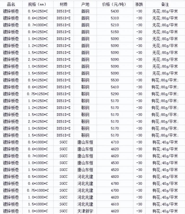 ? ? 那么,今日鍍鋅鋼材價(jià)格多少錢一噸?今日鍍鋅鋼材價(jià)格是有小幅度下跌的,具體看下表:
